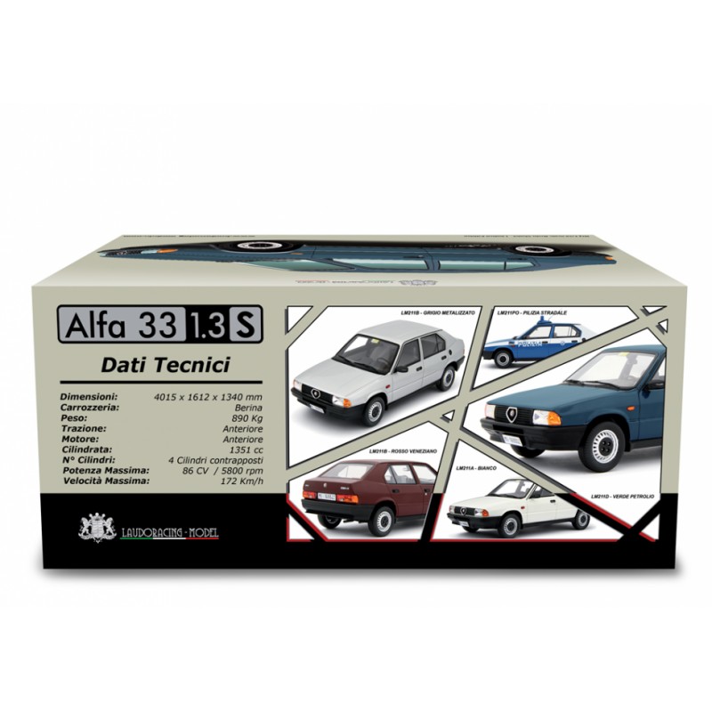 Alfa Romeo 33 1.3S Edizione 1985, LM211D, zelená barva. Resinové modely aut Laudoracing-Model 1:18. Modely aut Alfa Romeo 33 1.3S Edizione, modelový rok 1985, mají více barev karoserie. Pro zelenou barvu je stanoven počet 299 vyrobených kusů. Alfa Romeo 33 byla poprvé představena v roce 1983 jako pětidveřový hatchback s benzínovým motorem o objemech 1.3 a 1.5 litru. O rok později byla představena verze 1.3S. V roce 1986 přišel facelift s benzínovým motorem 1.7 a v roce 1990 druhá generace. Karoserii modelu Alfa 33 hatchback vytvořila automobilka Alfa Romeo, kombi pak Pininfarina. Alfa Romeo 33 byla po ukončení výroby v roce 1995 nahrazena modely Alfa Romeo 145 a 146.