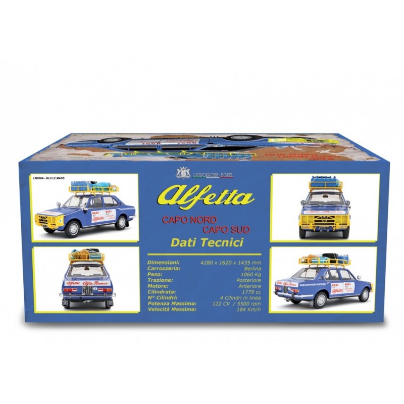 Resin model cars Alfa Romeo Alfetta 1.8 Raid Capo Nord Capo Sud 1973, LM208A, blue color. Resin model cars by Laudoracing-Model, 1/18 scale. Limited edition 499 pieces.